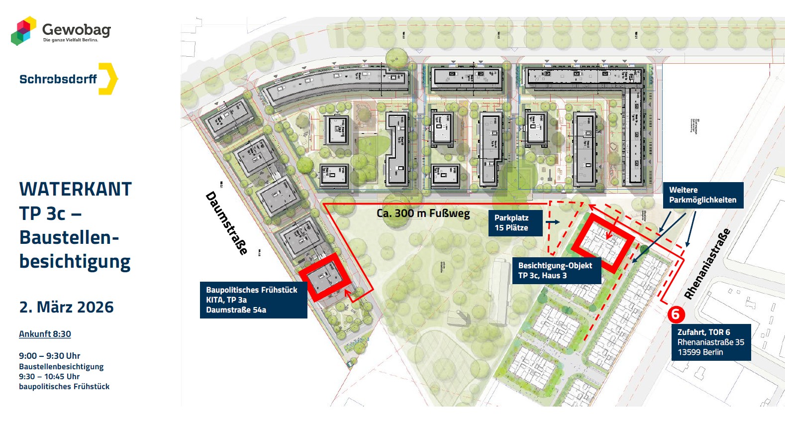 Im Mittelpunkt des Gesprächs stehen die aktuellen baupolitischen Herausforderungen in Berlin, die Rahmenbedingungen für den Wohnungsneubau sowie die Bedeutung einer verlässlichen Zusammenarbeit von Politik und Bauwirtschaft. Eine Skizze des Geländes mit Hinweisen zu Parkmöglichkeiten der Teilnehmer (Zufahrt, TOR 6 Rhenaniastraße 35, 13599 Berlin) sehen Sie nachfolgend. Bitte beachten Sie: Festes Schuhwerk ist auf der laufenden Baustelle erforderlich. Schutzhelme und Warnwesten wer-den von der Schrobsdorff Bau AG zur Verfügung gestellt.