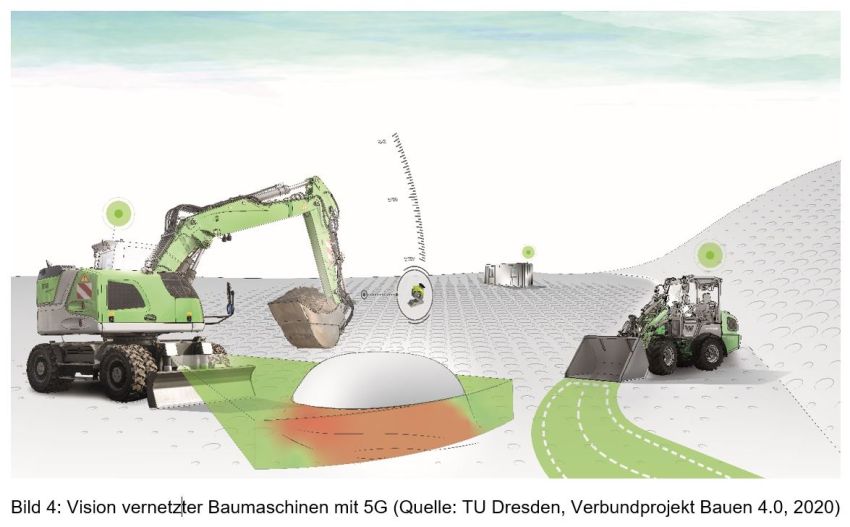Im Rahmen des Verbundprojektes „Bauen 4.0“ wird das Thema des digitalen und vernetzten Bauens auf der Baustelle in drei Schwerpunkten untersucht.6 Einen Schwerpunkt stellt die Erforschung von automatisierbaren, vernetzten Arbeitsmaschinen für Automatisierungs und Überwachungslösungen auf der Baustelle dar. Der zweite Schwerpunkt bezieht sich auf die Kommunikationsfähigkeit der Maschinen und eine Vernetzung über 5G-Technologie. Über die Entwicklung einer Baustellen-Cloud soll die Kommunikation der Maschinen ermöglicht werden. Der dritte Forschungsschwerpunkt beschäftigt sich mit der Digitalisierung von Prozessen und Lösungen für eine digital vernetzte Baustelle und legt somit die Basis für die Verarbeitung verschiedenster Daten auf der Baustelle. Dabei spielt z. B. das Tracing und Tracking von Personen, Geräten und Materialien eine große Rolle, also die Nachvollziehbarkeit und Transparenz von Ressourcenverbräuchen auf der Baustelle. Das Zusammenspiel der drei Schwerpunkte kann beispielsweise die automatische Steuerung von Baggern zur Herstellung von gekrümmten Böschungen im Einschnittbereich von Straßen ermöglichen. Denkt man an die Leistungsfähigkeit von Fahrzeugassistenzsystemen bei PKWs und die Entwicklungen beim autonomem Fahren, ist sehr gut vorstellbar, wie in Kombination mit dem BIM-Modell und vielen weiteren Dateninformationen im Baufeld automatisierte Steuerung von Baufahrzeugen funktionieren wird. Weithin sehr praktikabel und nützlich wird beispielsweise die automatisierte Verfolgung und Dokumentation der Erdbewegungen einer Baustelle im BIM-Modell sein: Im digitalen Zwilling des Geländemodells wird zukünftig Herkunft, Transportweg und Einbauort eines jeden Kubikmeters bewegten Erdstoffs visualisiert und nachvollziehbar dokumentiert sein.